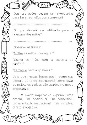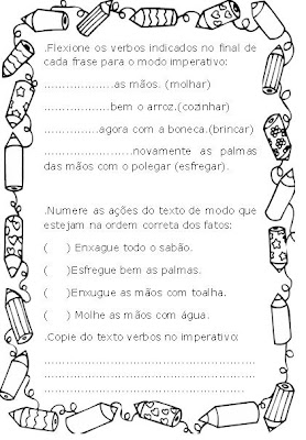 Na página a seguir, o trabalho mais aprofundado sobre verbos no modo imperativo, onde além da teoria, a professora oralmente mostrará ao aluno que o texto instrucional normalmente utiliza os seus verbos ou ações nesse modo, que torna o texto mais claro, mais simples e objetivo.